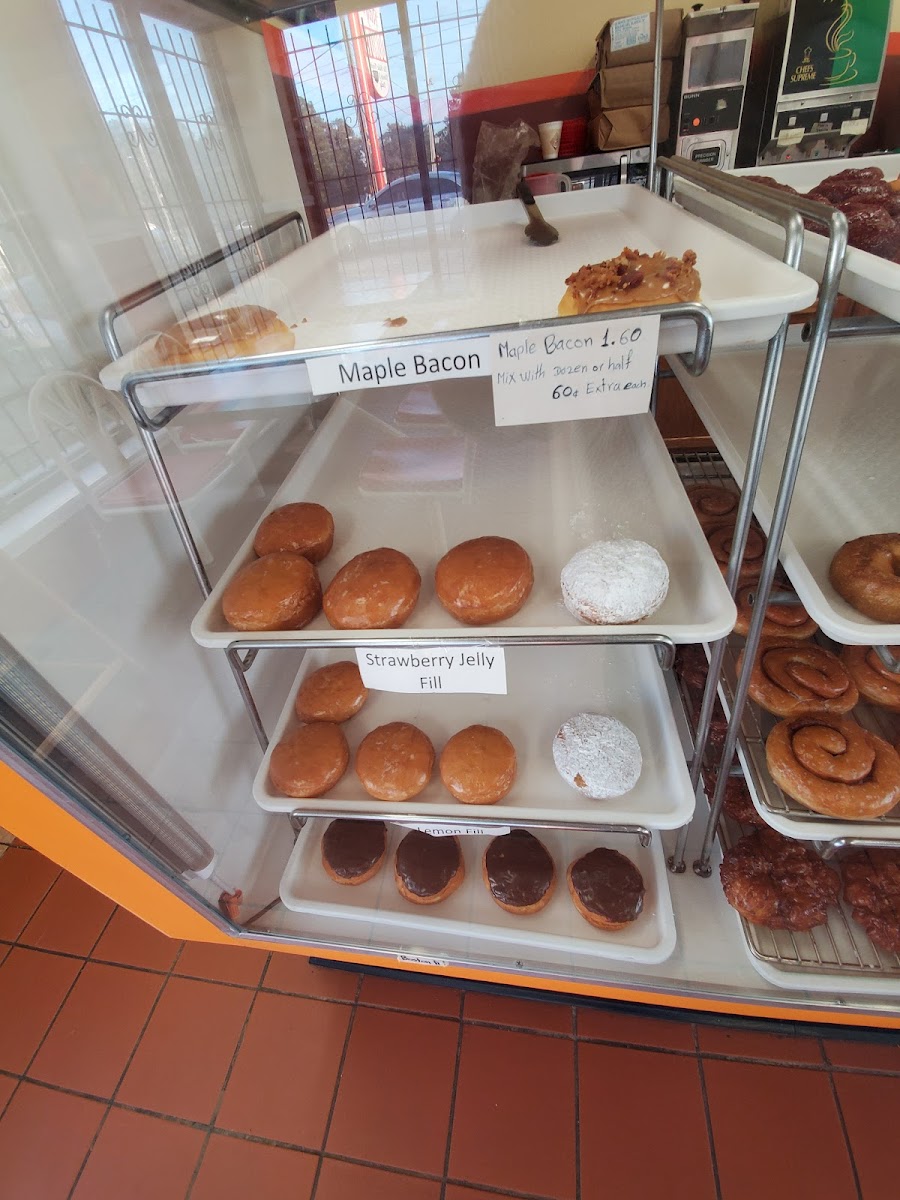 Saw this place while I was across the street at "Gutbusters" waiting for my food. Decided to go there for more Big-Back activity. Lol I got 2 strawberry filled donuts and 2 maple bacon donuts . Both were good, but the maple bacon donut was by far the better of the two. The strawberry filled donut didn't have any strawberry in the filling, just an artificially flavored gel that smelled like a strawberry car air freshener. It wasn't bad, but I expected a filling made with actual strawberries.
